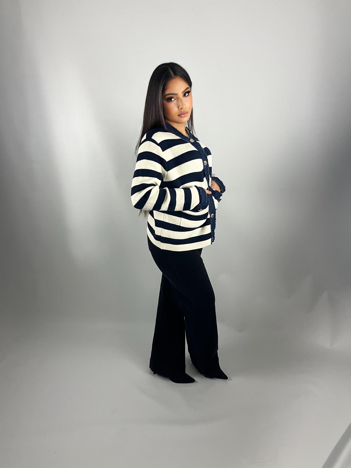 Un gilet chic à rayures marines, à porter seul ou sur un top. Matière douce et coupe légèrement oversize pour un style casual et élégant.