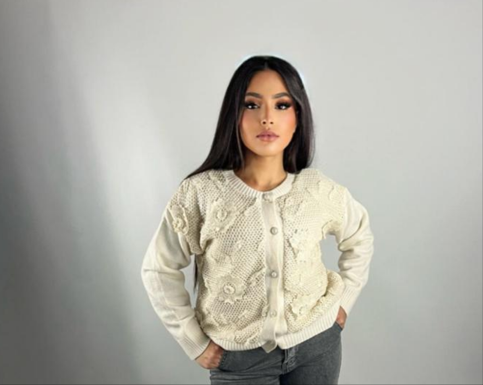 Un gilet doux et élégant, orné de détails en relief pour une touche romantique. Parfait sur un jean ou une jupe pour un look chic et cosy.